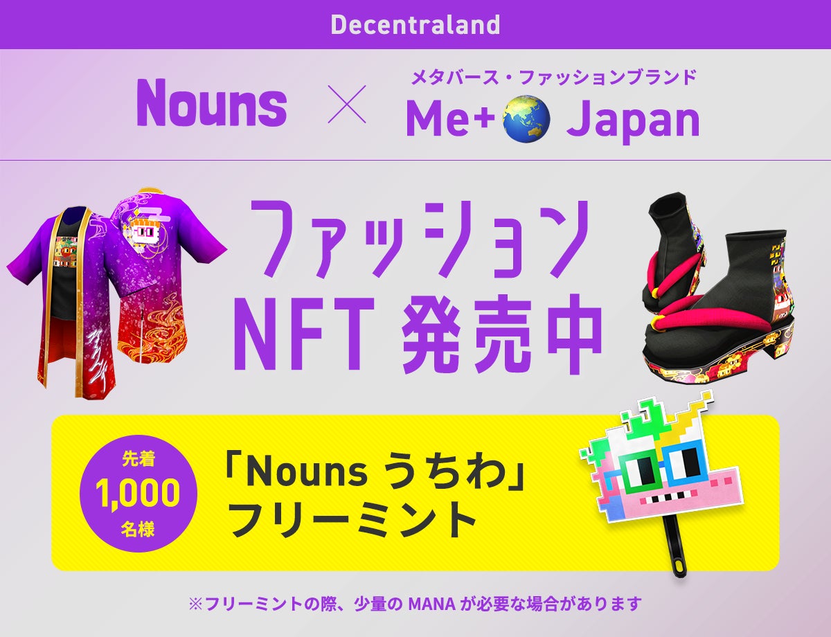 本日、一般社団法人オタクコイン協会・株式会社FORCESは、メタバース上に新たなファッションブランドを創出する実証実験として、有力メタバースサービス「Decentraland」上で着飾れるメタバース・ファッションブランド『Me+🌏 Japan』の第5弾、CC0で商用利用可能なweb3の究極系『Nouns』のキャラクターをモチーフにしたデジタルファッションアイテム(NFT)の販売を発表しました。