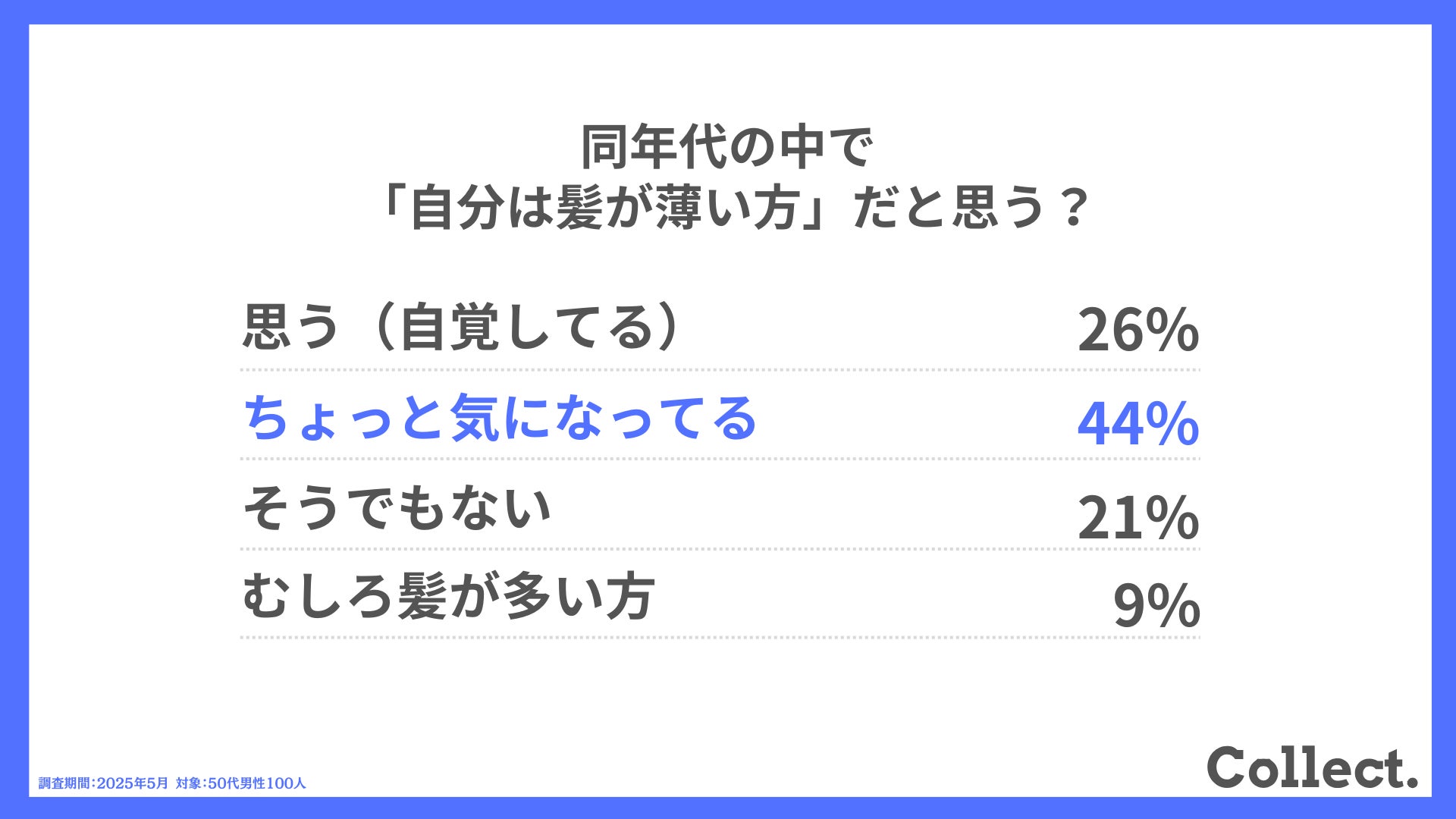 50代では「ちょっと気になってる(44%)」が最多となり、「思う(自覚している)」と合わせて7割以上が同年代と比べたときに自分が薄毛と考えているようです。