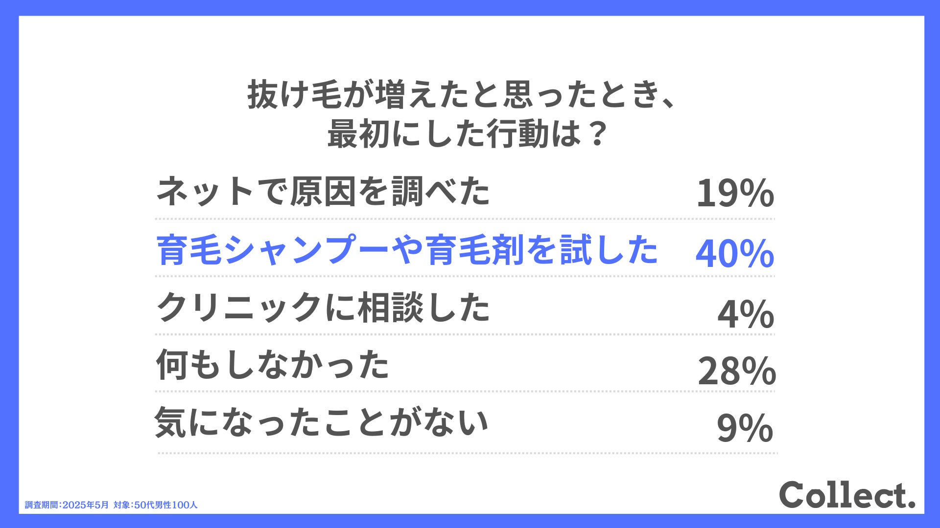 50代の抜け毛対策は「育毛シャンプーや育毛剤を試した(40%)」を筆頭に、「クリニックに相談(4%)」という行動派も。まずは手軽なセルフケアからはじめる姿勢が目立ちました。