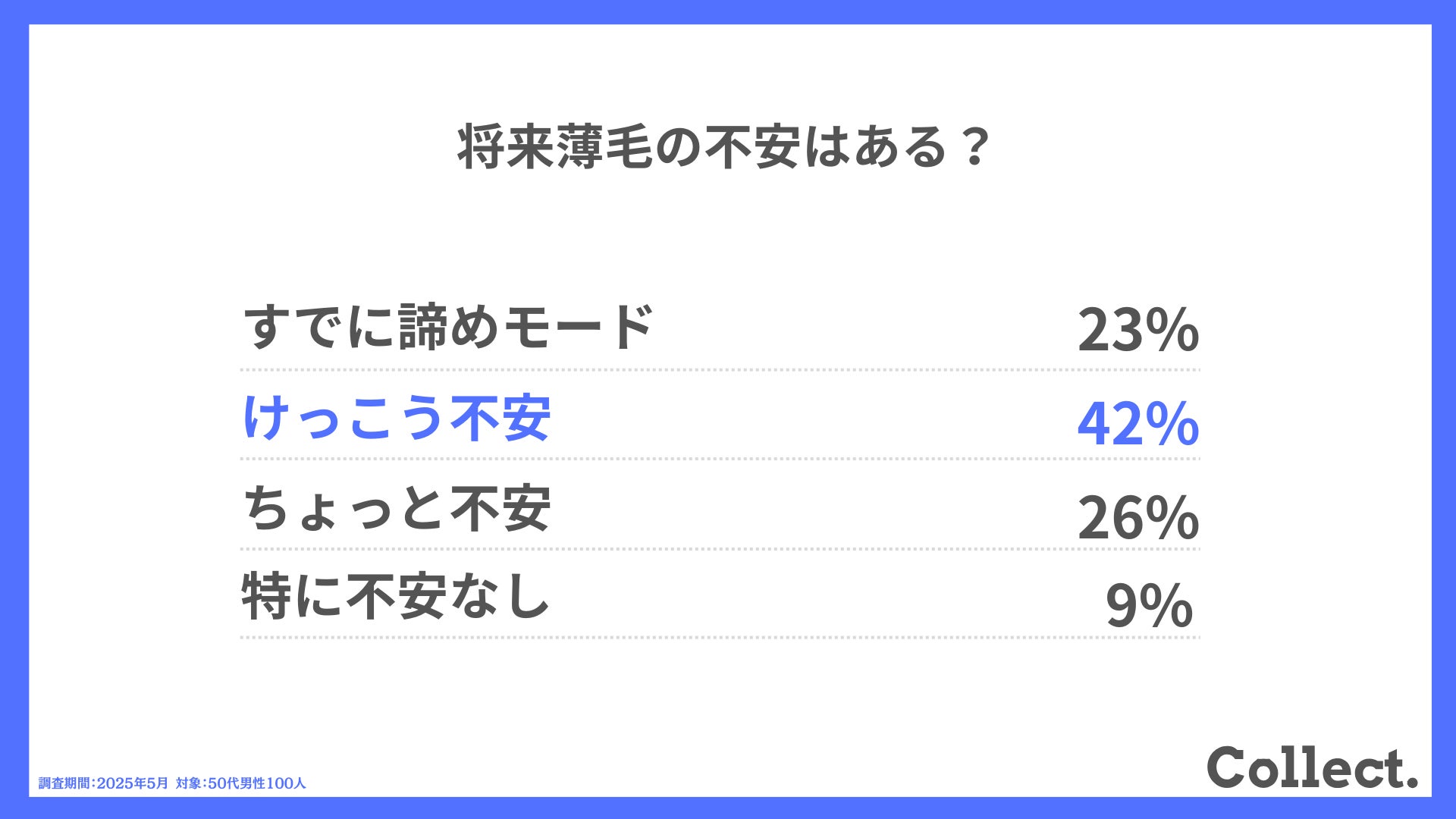 約7割が将来の薄毛不安を抱えている。2割強は諦めモード