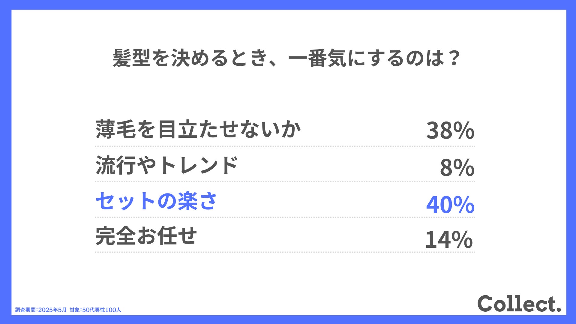 髪型を決めるときに重視するのは「セットの楽さ(40%)」と「薄毛を目立たせないか(38%)」がほぼ同率となりました。加齢とともに、手軽さよりも薄毛対策を重視する傾向があるようです。