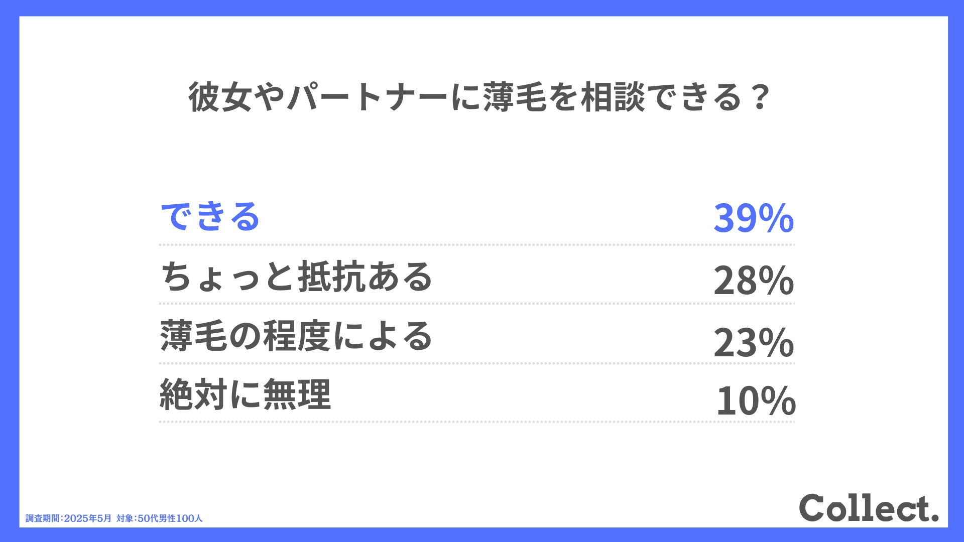 50代では程度の違いこそあるものの、約4割の方が「できる」と回答。年齢を重ねることで、薄毛の相談もしやすくなると言えるでしょう。