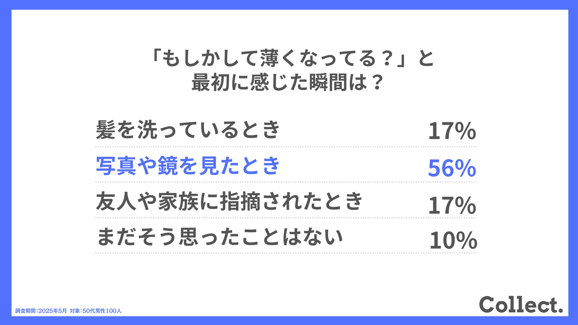薄毛を実感したタイミングは「写真や鏡を見たとき(56%)」がもっとも多く、「髪を洗っているとき(17%)」が続きました。日常のふとしたタイミングで、頭髪の変化を認識することが多いようです。
