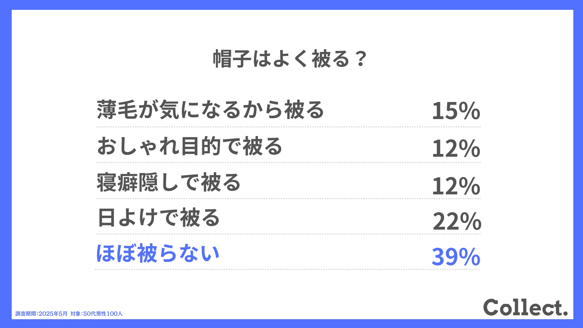 「ほぼ被らない(39%)」を除くと、帽子を被る理由は「日よけ(22%)」がトップ。次いで「薄毛が気になるから(15%)」となりました。