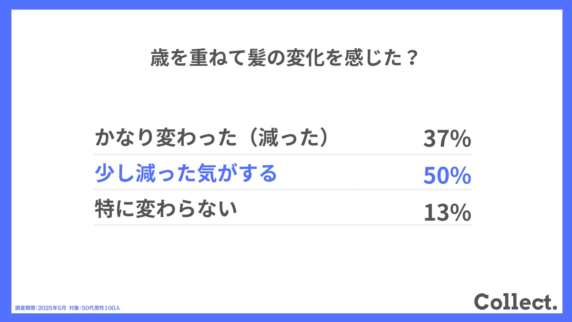 「少し減った気がする」「かなり変わった(減った)」を合わせて87%となり、50代だと大半の方が髪の変化を実感しているようです。
