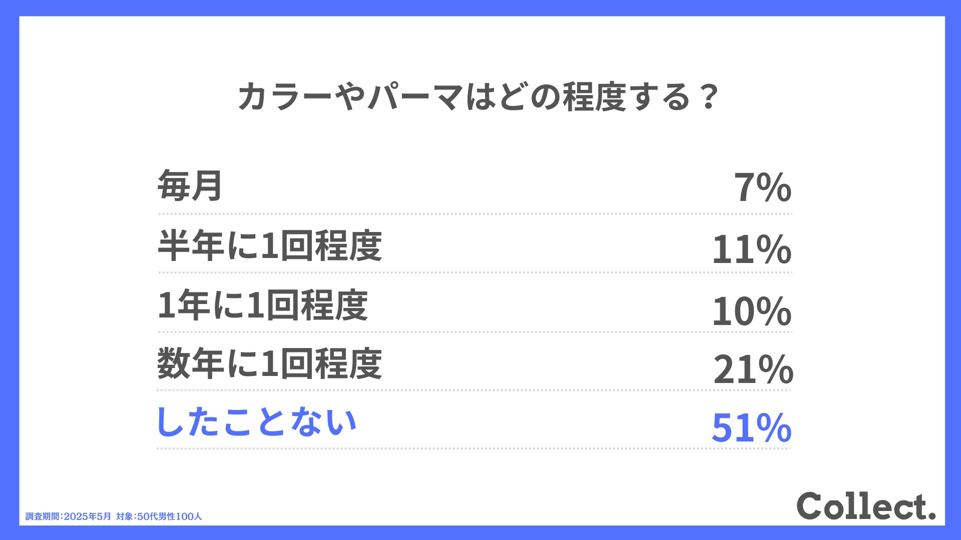 カラーやパーマは「したことない」が半分を超え、これを除くと「数年に1回程度(21%)」「半年に1回程度(11%)」と、カラーやパーマをする人でもそれほどひんぱんにしないという結果となりました。