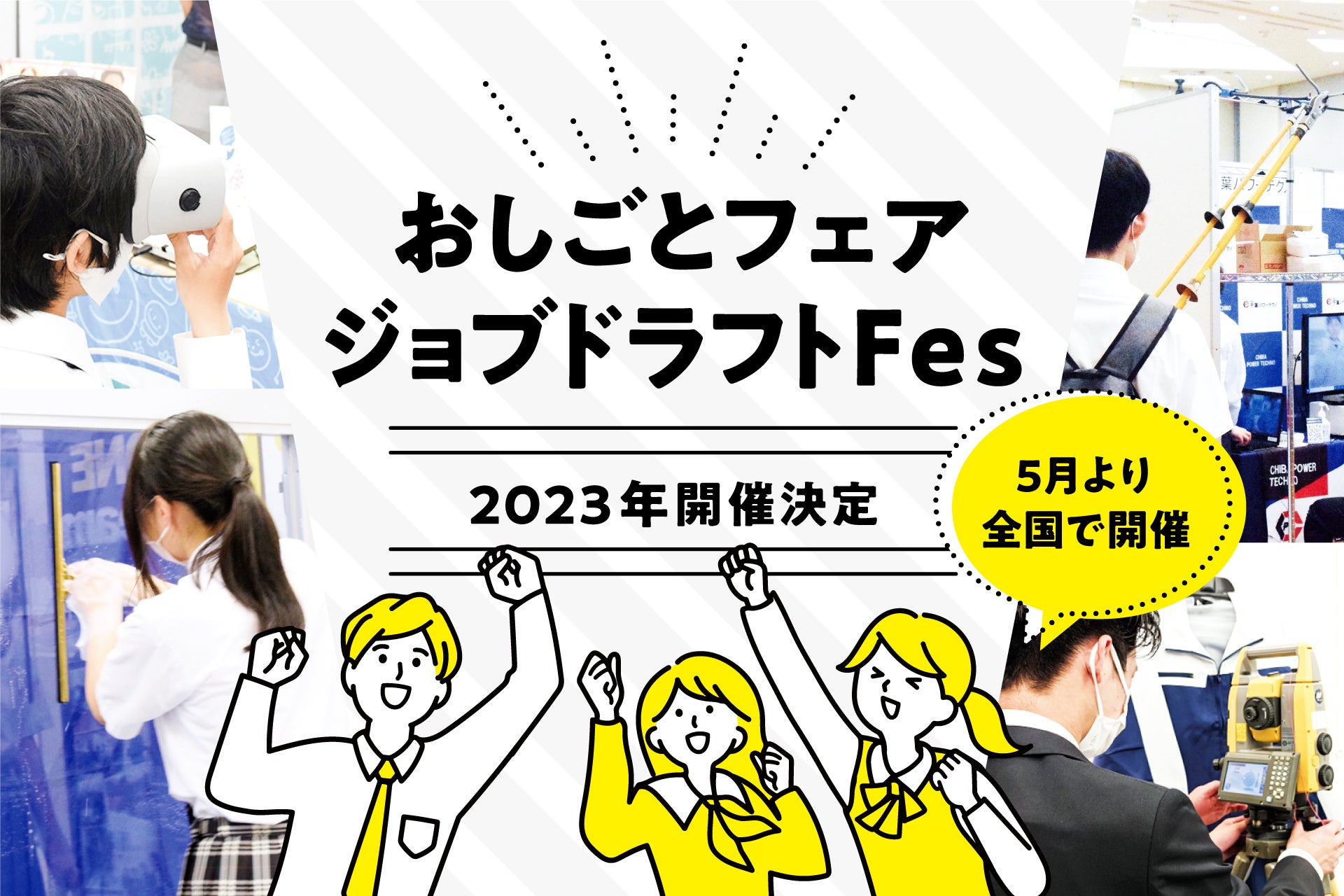 就職活動開始前の5月・6月は、様々な企業の仕事体験を通じて勤労観・職業観を醸成する職業体験イベント「おしごとフェア」を、就職活動がスタート後の7月と10月には高校生のための合同企業説明会「ジョブドラフトFes2023」を開催します。学校からの「企業研究における体験学習の重要性」の声にお応えするため、「おしごとフェア」は仙台・千葉・神奈川・栃木・茨城・京都・熊本・埼玉・立川で初開催の会場を増やします。本イベントを通じて、企業には高校生に対して業界や自社のPRを、高校生にはおしごと体験や企業の説明を通して業界や自身の興味関心を知るきっかけを創り、自己決定による進路選択を後押しいたします。