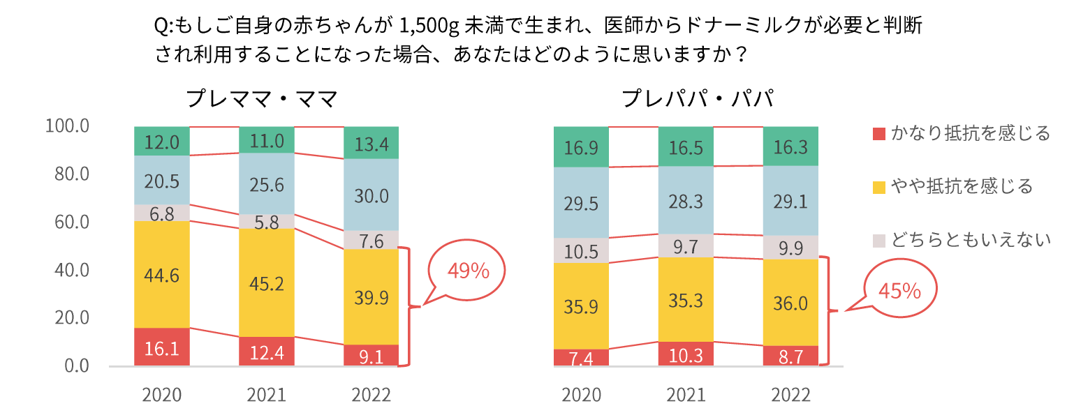 プレママ・ママがドナーミルクの利用に「抵抗がある」と答えた割合は、2020年は61%であったのに対し、2022年は49%となり、年々抵抗感は減少しているものの、依然約5割の方は抵抗を感じていることがわかりました。また、プレパパ・パパにおいても「抵抗がある」と答えた割合は45%(2022年)あり、プレママ・ママだけでなくプレパパ・パパにおいても同様に抵抗感があることが判明しました。★調査結果詳細 3.