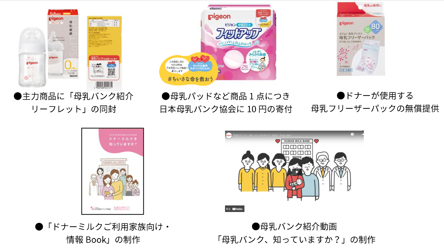 ピジョンは2020年から日本母乳バンク協会のゴールドスポンサーとして支援を開始、同年9月には、当時国内2拠点目となる母乳バンク「日本橋 母乳バンク」(運営:日本母乳バンク協会)を、当社の全面サポートによりピジョン本社1階に開設しました。また、当社の独自の強みである、ママ・パパ、プレママ・プレパパとの接点を活かし、国内シェア8割以上の商品パッケージに母乳バンクの情報を記載した他、母乳パットの売上の一部を同協会に寄付するキャンペーンを実施。さらに、社会への母乳バンクの普及およびドナーミルク利用の抵抗感を低減するため、普及啓発動画の作成や、情報Bookの無償提供などを行っています。