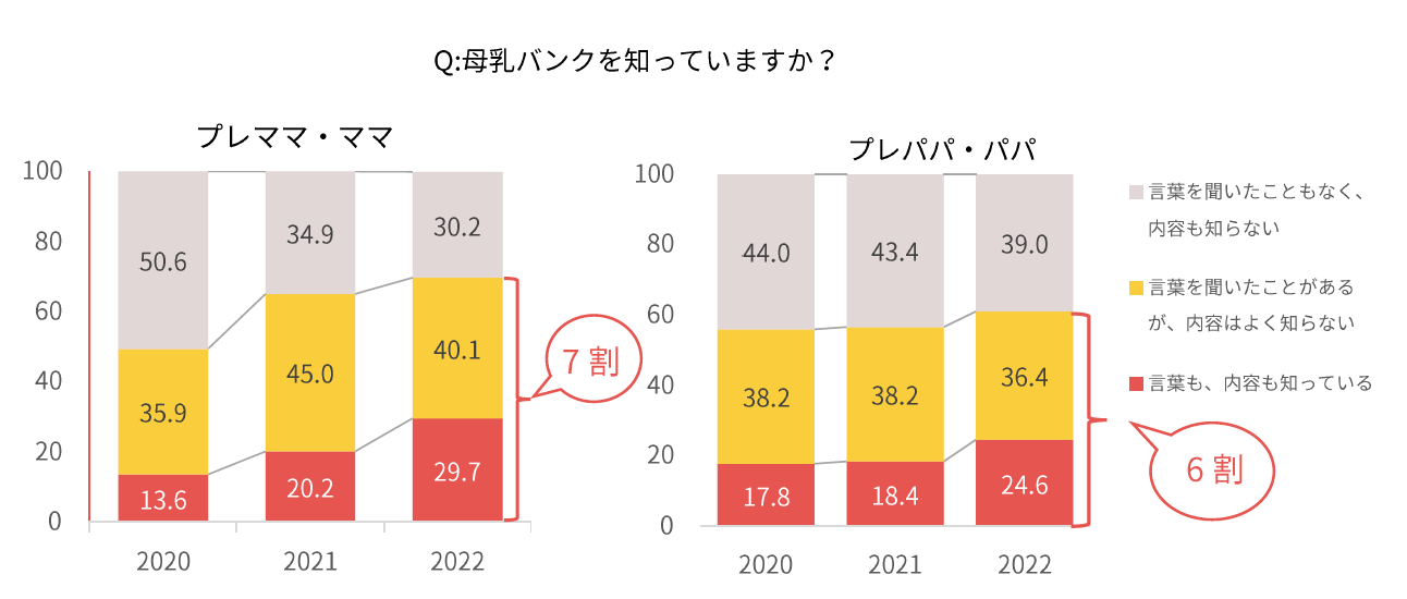 - プレママ・ママの母乳バンクの認知率は約7割、プレパパ・パパも約6割に到達