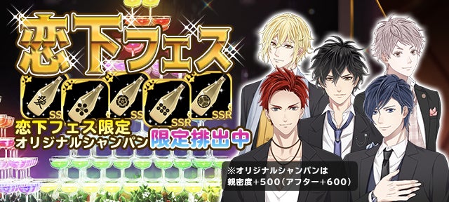 フェス限定オリジナルシャンパンを引き当て、club恋下で使⽤すると…最⾼クラスの親密度+500もアッ プするよ♪フェス中しか排出されない限定アイテムを是⾮ゲットして、彼と親密度を⾼めよう!