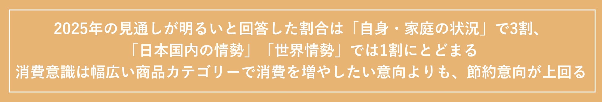 新しい年の始まりという気持ちが切り替わるタイミングではあるものの、2025年の見通しはやや後ろ向きな結果となり、消費行動への意識は引き続き節約ムードにあるようです。経済の上向きを実感できるのはいつになるか、その時が来るのを待ちたいと思います。