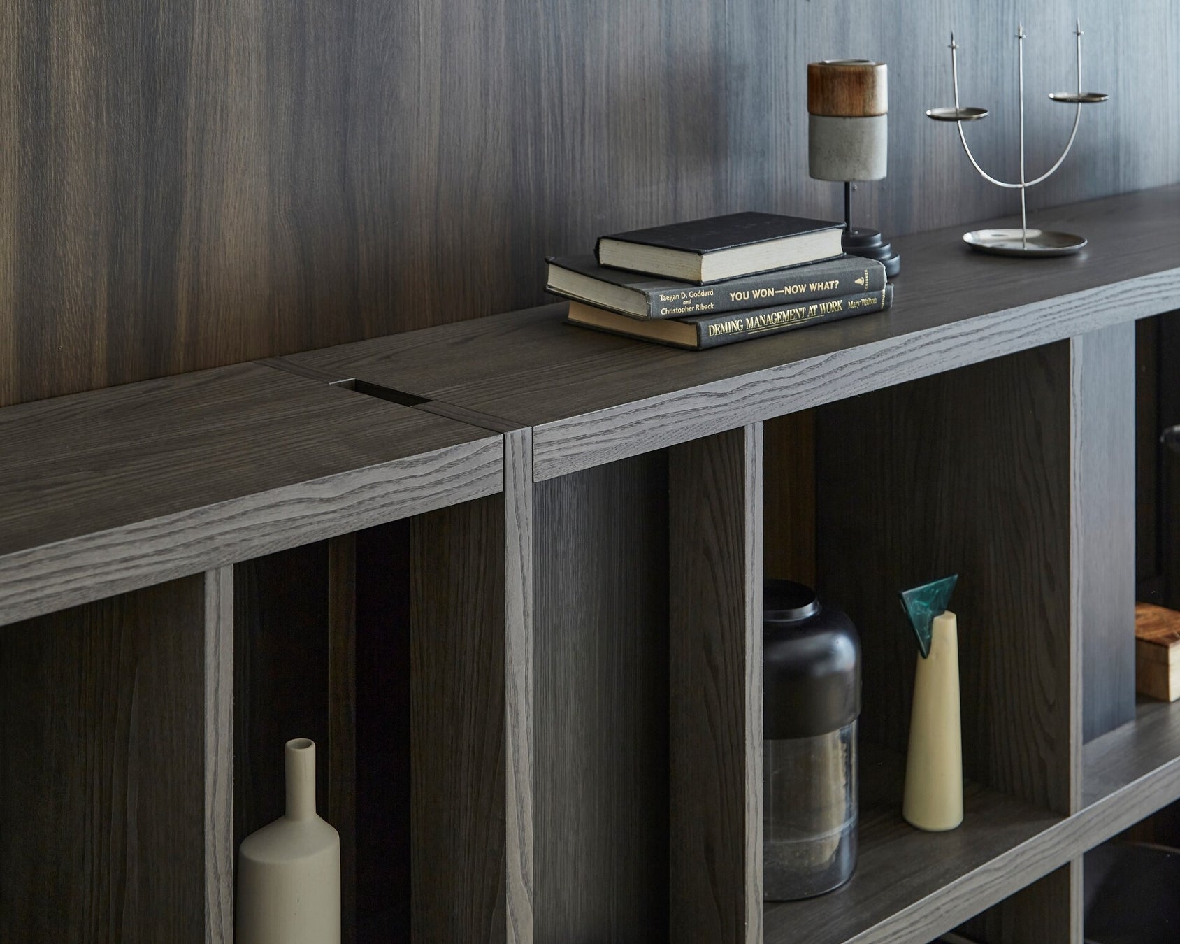 ローナシリーズは、間仕切りとしても、壁につけてもきっちり飾れて収納できるシェルフです。飾り棚部分には壁板をブラックにすることでアクセントをきかせ、奥行きを表裏で変えています。そのため立体的で効率よく収納できます。幅が90センチと180センチのハイタイプとロータイプ、ブックシェルフを展開しています。カラーは従来のウォールナット、オークに加えて今回ご紹介する新色グレーを追加し、合計3色で展開します。