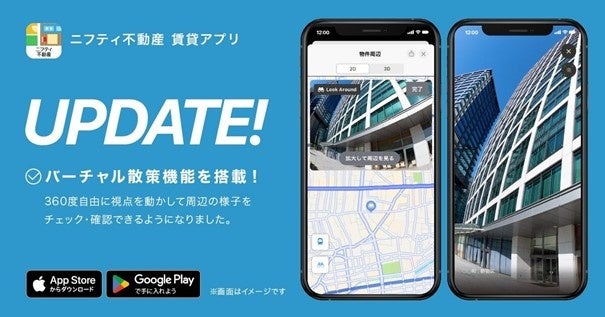 写真のような固定視点ではなく、360度自由に視点を動かして歩き回ることが可能。物件の外観や近所のお店など、ユーザーが見たい情報を取得することができます。「気になる物件の近くにはどのようなお店があるのか」「駅までの道はどのような雰囲気か」「駐車場にはマイカーを停めやすそうか」など、新しいお部屋での生活を想像してワクワク感を高めるのにも、不安の解消にも役立つ機能となりそうです。