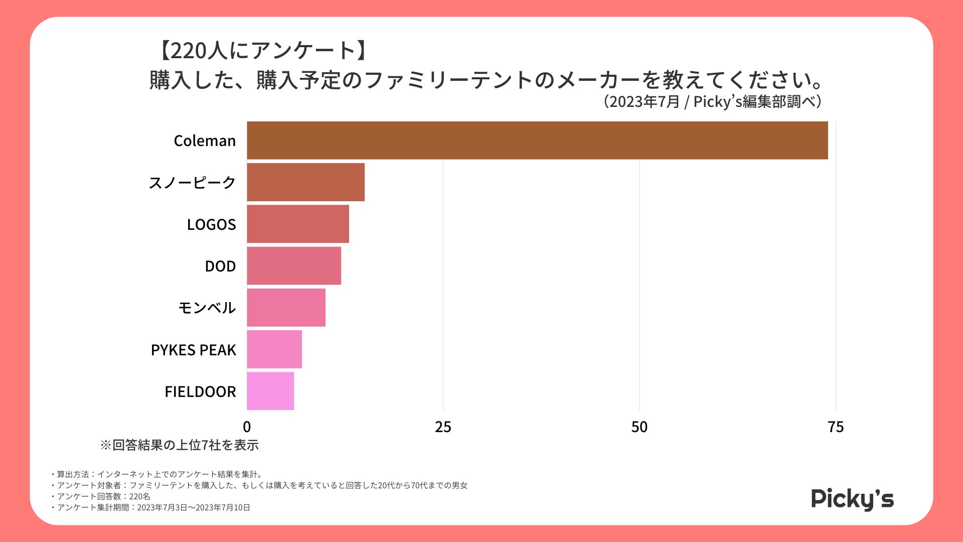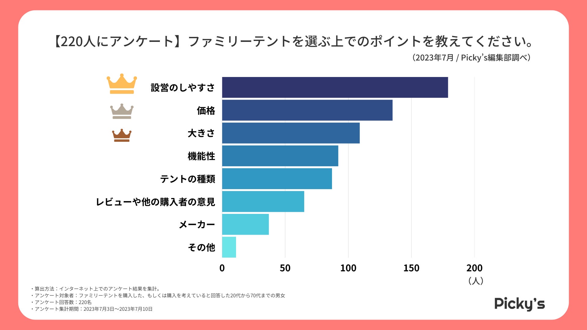 「Picky’s」は、インターネットショッピングにおいて、購入前に試せない・選ぶべきものがわからないという課題の解決を目標に、あらゆる商品のおすすめランキングや検証レビューを紹介するサイトです。このたびPicky’s(https://rentry.jp/note/)では、ファミリーテントについてインターネット上でアンケート調査を行いましたので発表いたします。
