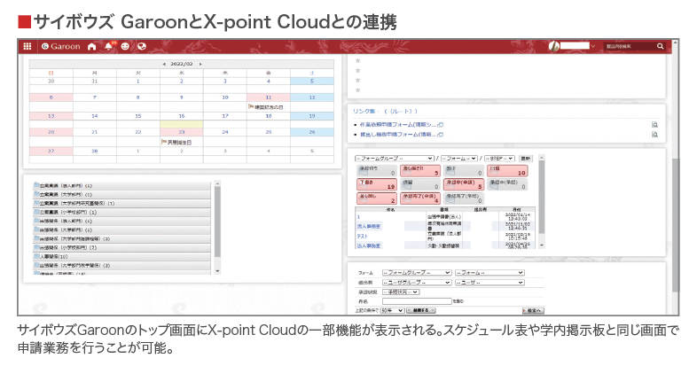 従業員の抵抗感を軽減する工夫の一環として、まずご担当者様の所属する法人本部でのスモールスタートによる導入で運用を開始していただきました。京都女子学園で既に利用されていたグループウェア「サイボウズGaroon」、「CloudGate UNO」とX-point Cloudを連携し、3つのシステムをシームレスに利用でき、基幹システムと同様に業務の根幹を担う「準基幹システム」とも呼べる仕組みを構築。効率的かつセキュアな申請業務を実現しています。