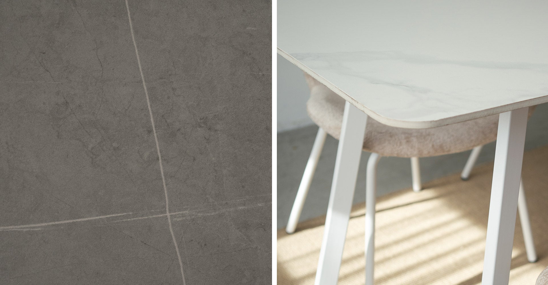 石目調の高級感あふれるセラミックテーブルはホワイトマーブルとストーングレーの2色展開です。チェアはご自宅のものを組み合わせたり、別途お買い求めいただく形となります。