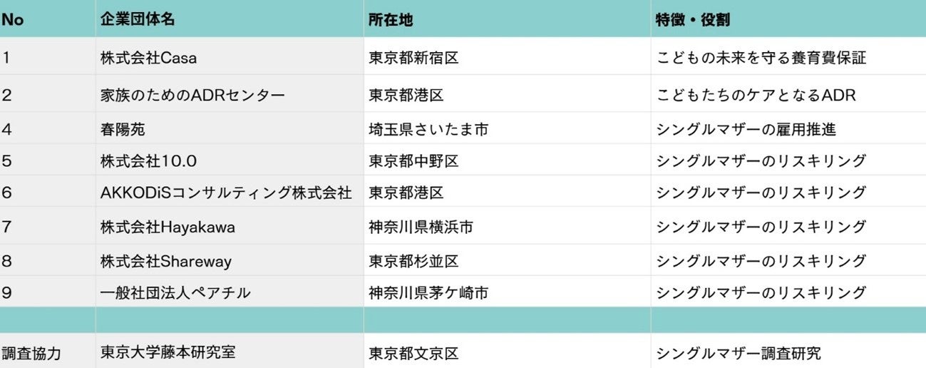 本協議会は、ひとり親の就労機会を創出・拡大するため、以下の企業・団体と連携します。