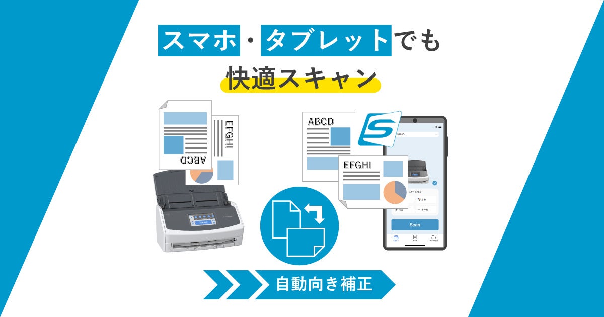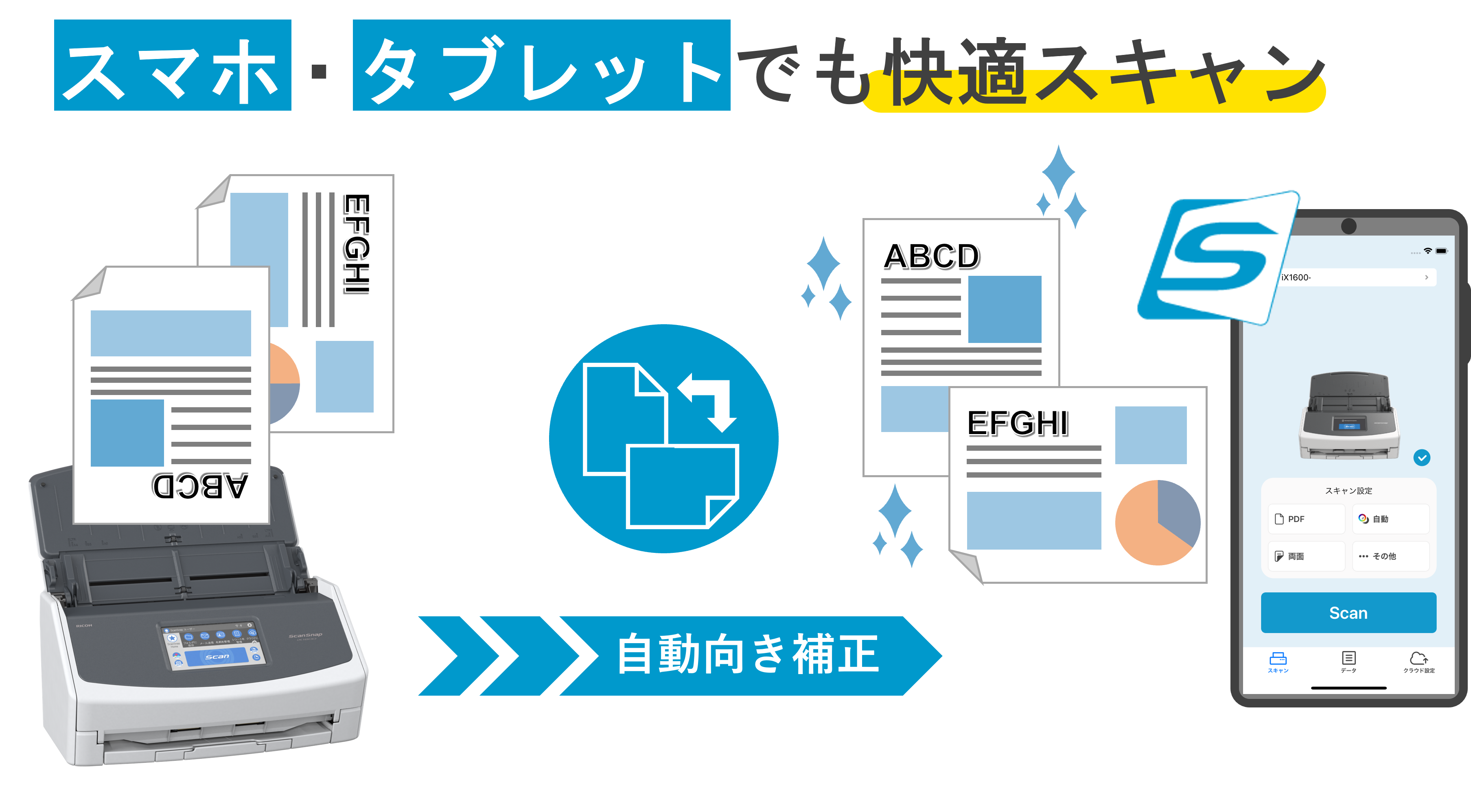 スマートフォンやタブレット(注1)向けのご要望の中でも、非常に多くご希望の声をいただいていた、自動向き補正に対応しました。原稿の天地や縦横の向きを認識して自動補正する機能をスマートフォンやタブレットでも利用可能になります。
