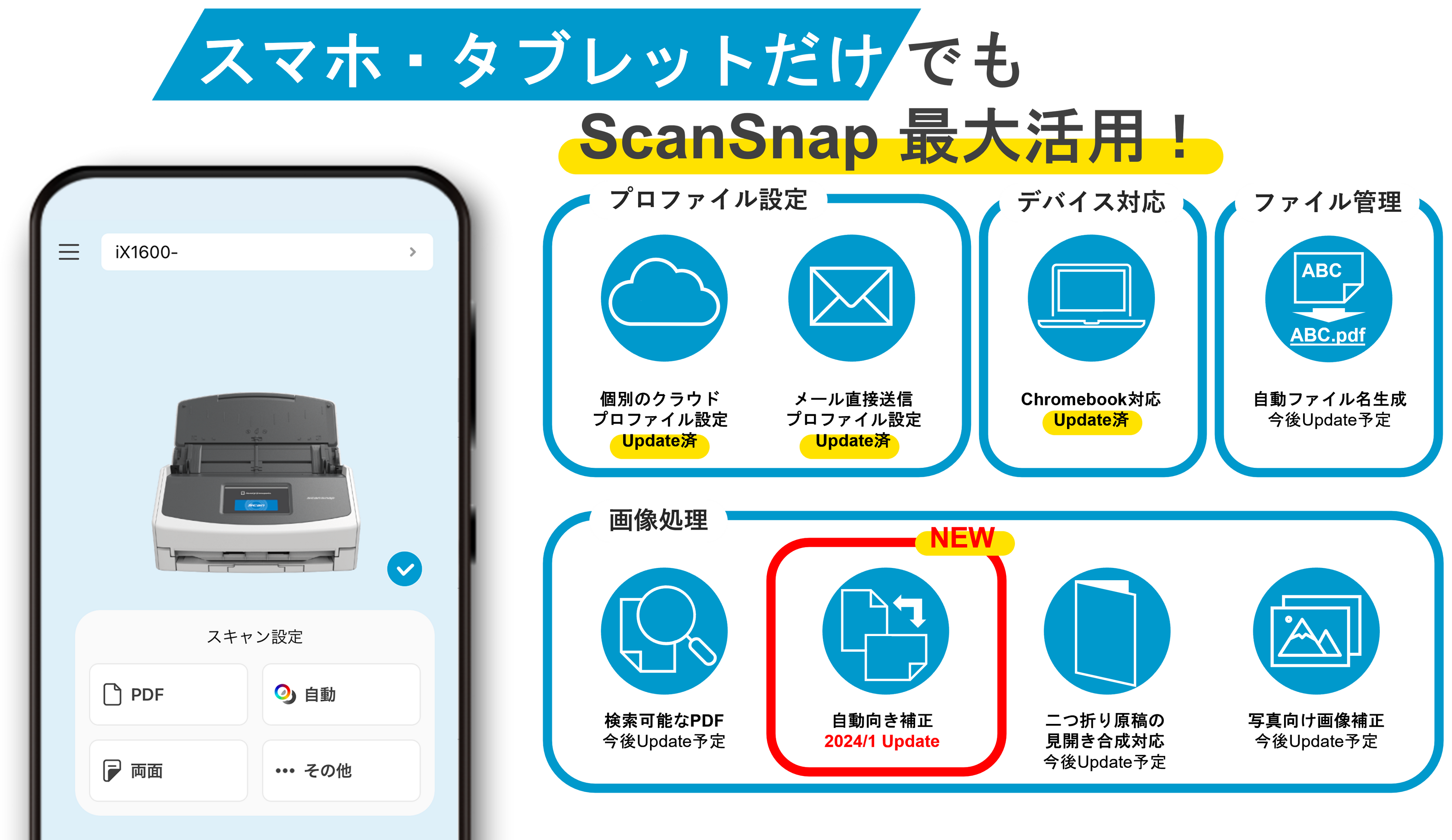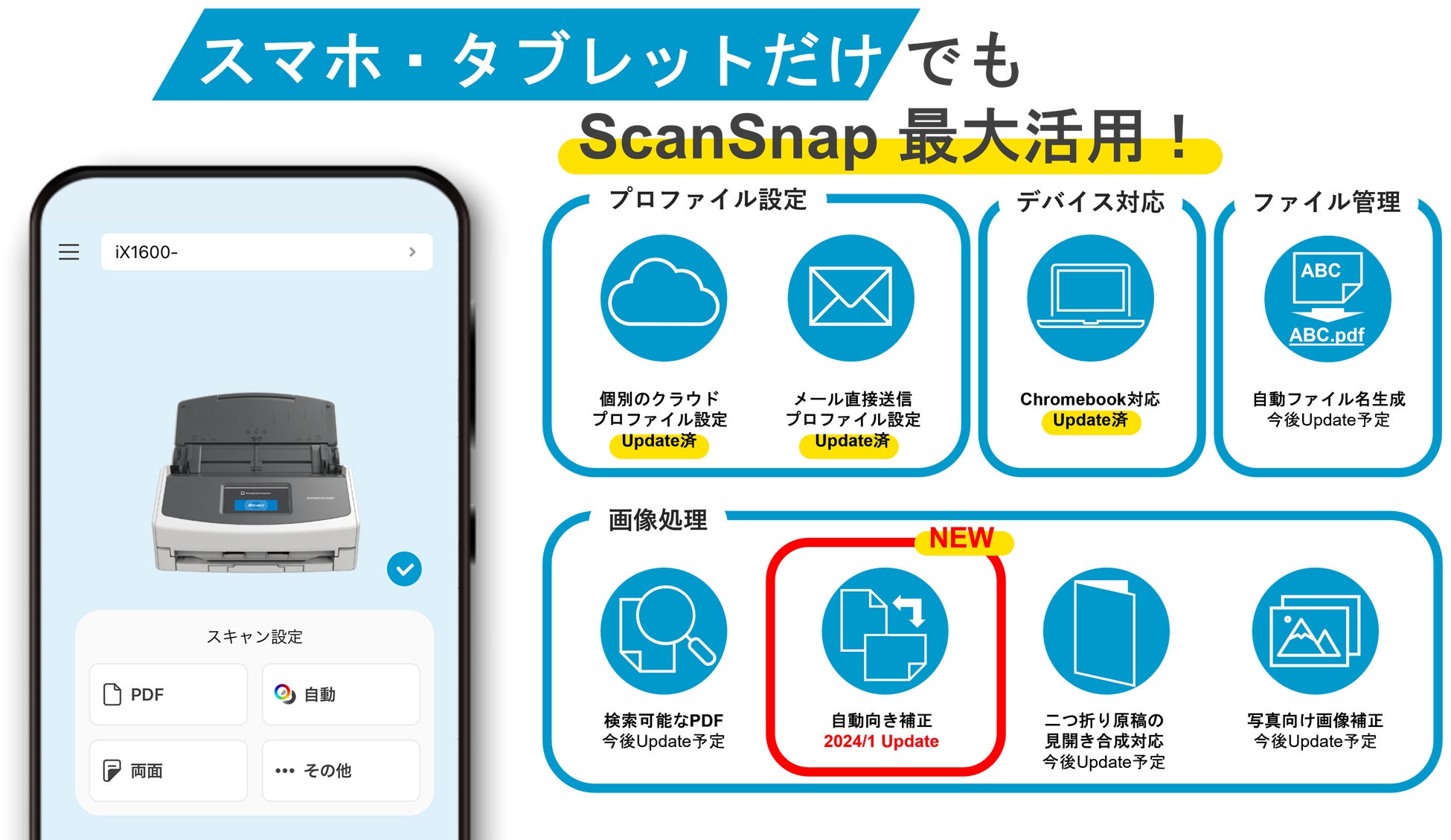 また、先般2023年10月31日のプレスリリースでご案内の通り、モバイル版ScanSnap Homeは今後もスマートフォン・タブレットだけでもScanSnapを最大限活用いただけるよう様々なアップデートを予定しております。