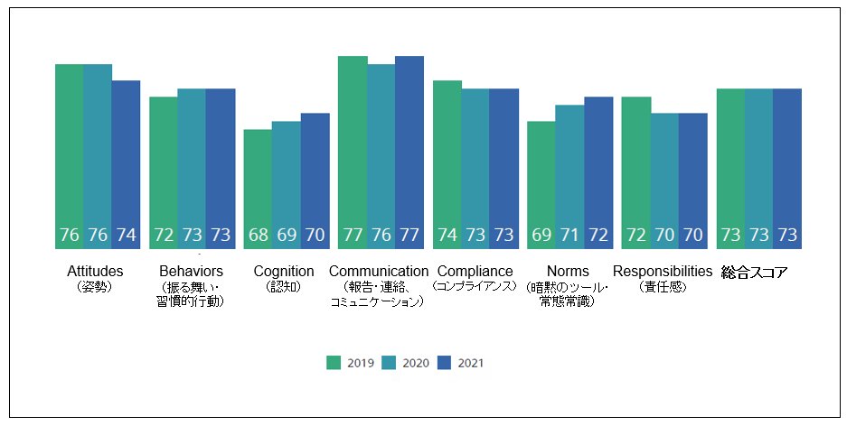 セキュリティカルチャーを総合スコアだけで見ると、この3年間、何も変わっていないように見えます。世界平均で総合スコアは73点と、セキュリティカルチャーの醸成は停滞しているように見えます。