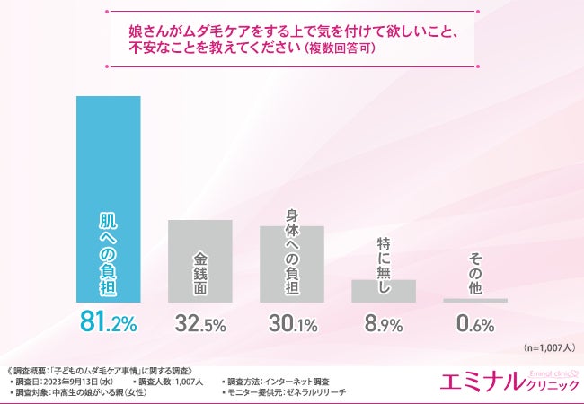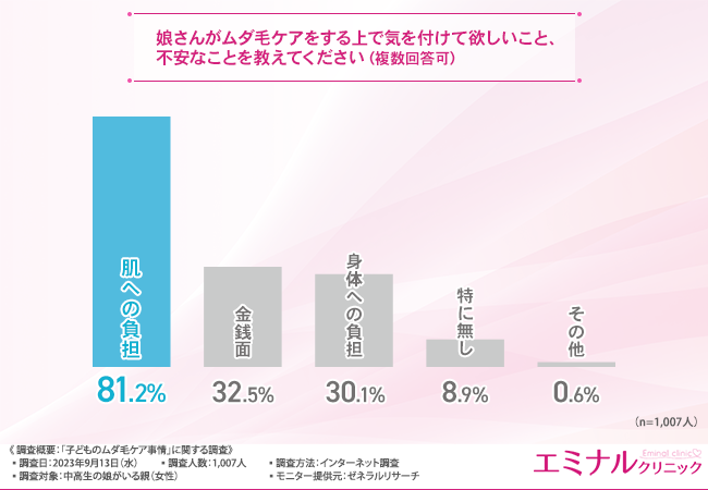 一方、約8割の親御さんがムダ毛ケアによる肌への負担が不安であり、気をつけてほしいと思っていることもわかりました。