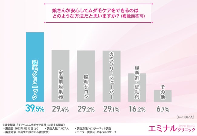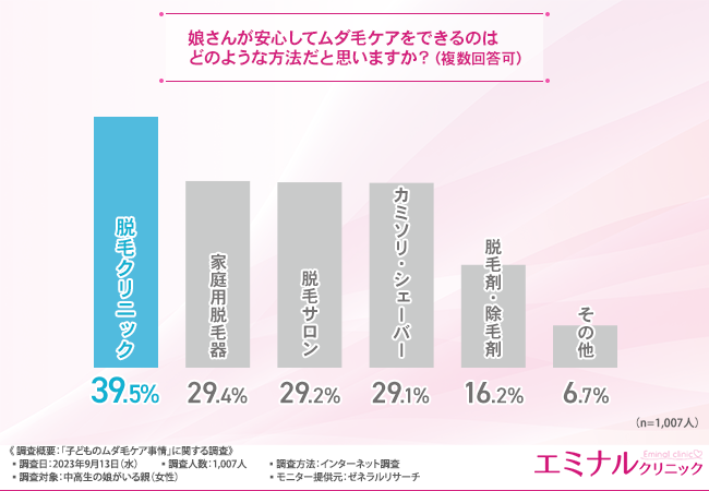 さらに、およそ4割の方が、脱毛クリニックであれば安心してムダ毛処理ができると回答しています。脱毛クリニックに信頼を寄せる親御さんが多いことが浮き彫りになりました。