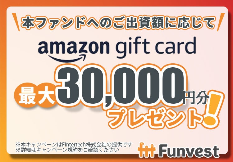 本ファンドへ出資していただいた投資家の皆様を対象として、出資額に応じて最大30,000円分のAmazonギフトカードをプレゼントするキャンペーンも併せて実施いたします。