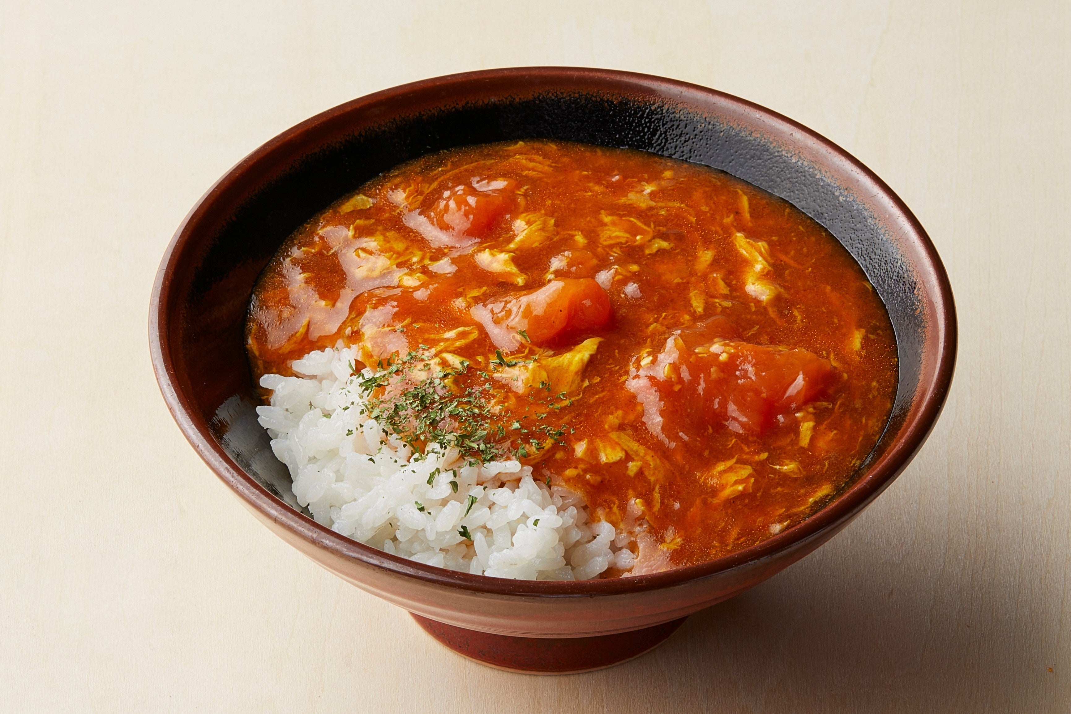 トマたまカレーは、毎日店舗で引く香り高い白だしとカイエンペッパーの辛み、トマトの程よい酸味と溶き卵のまろやかさが特徴。とろみまでこだわったカレーは、打ち立てうどんとの 相性はもちろん、ほんのり甘みのあるごはんとの相性もばっちりです。
