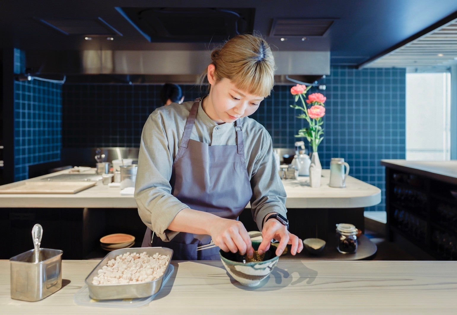 日本の旬の食材と発酵をテーマにする「TOUMIN」は、素材の個性や魅力を最大限に引き出し、産地で食べるよりも美味しい新しい味わいを追求しています。12席のオープンカウンターでは、最初の一品からフィナーレのデザートまでひと皿ずつお客の目の前で盛りつけて仕上げています。