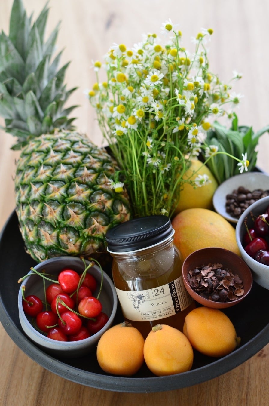 6月は、14(金),15(土),22(土)の3日間限定で開催。春から夏に移りゆく中で旬を迎える長野県武六園のさくらんぼ、沖縄県のはらファームのマンゴー、OmeFarmのはちみつやカモミールを中心に全5皿のコースメニューにて、産地の景色や香りを堪能いただけます。