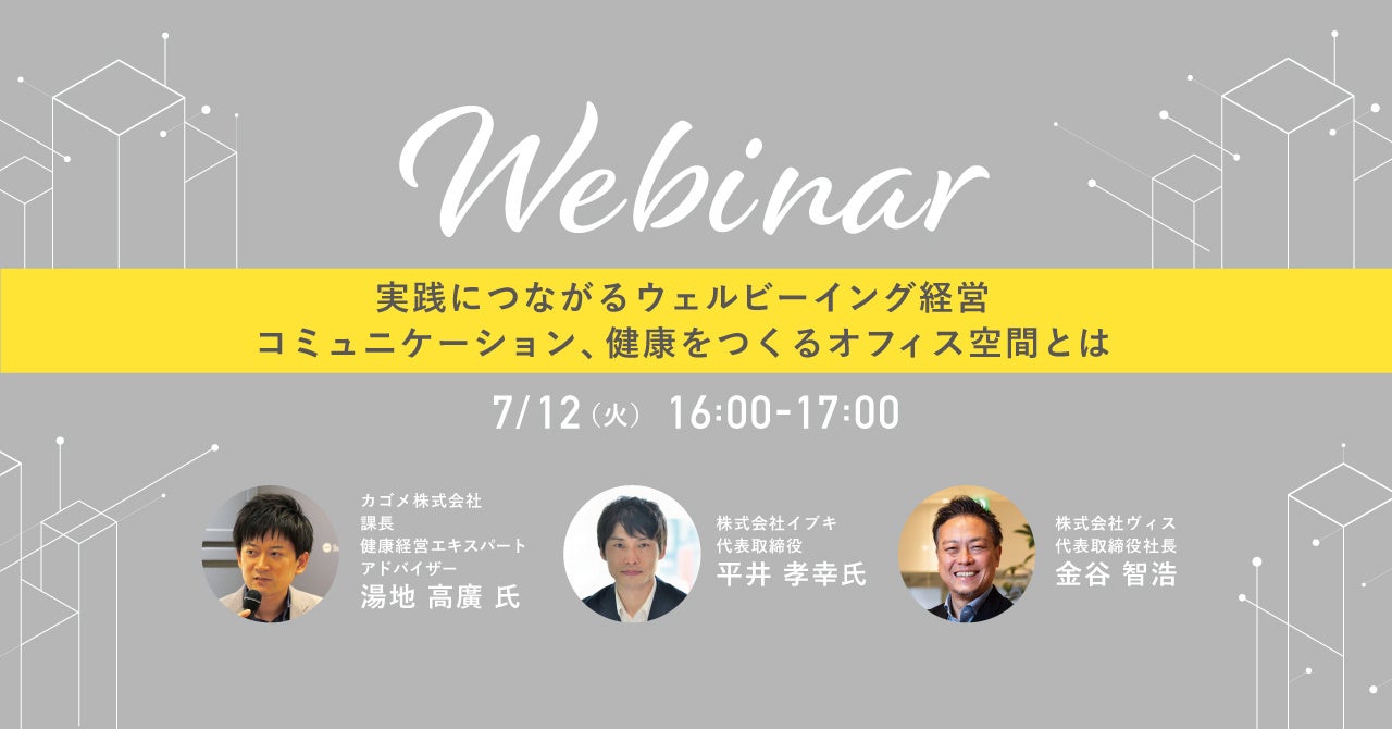 デザイナーズオフィスを手がけ、「はたらく」をデザインする株式会社ヴィス(本社:大阪市北区、代表取締役社長:金谷智浩)は、2022年7月12日(火)に、カゴメ株式会社、株式会社イブキと共催で無料オンラインセミナー「実践につながるウェルビーイング経営ーコミュニケーション、健康をつくるオフィス空間とはー」を開催することをお知らせします。