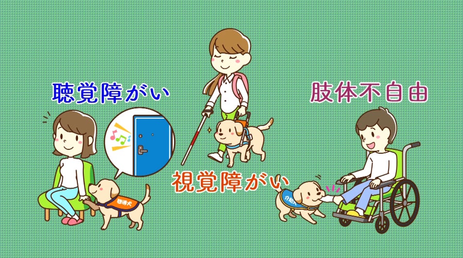 ・聴導犬:聴覚障がい者へ音を教える、又は音源まで誘導する