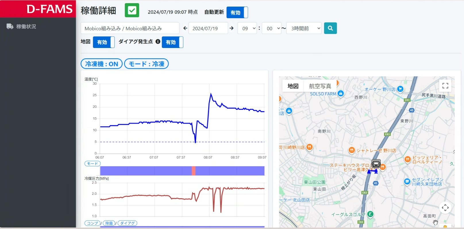 また、運用面での負担軽減を目的として、IoTサービス『D-FAMS』(※)のオプションサービス設定を検討しています。D-FAMSは車両の位置情報や温度データなどを遠隔で管理できます。またD-mobicoの送風停止や冷媒漏れ等の異常を検知することで、トラブルの原因特定や計画的な車両運行に貢献することを目指しているサービスです。