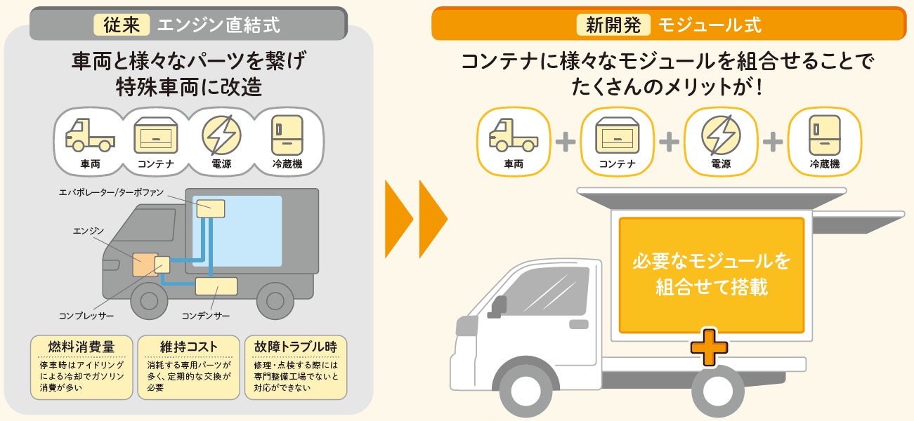従来の移動販売車は、冷蔵庫の動力が車両のエンジンと一体となっているため、冷蔵を続けるために停車中もアイドリングが必要でした。