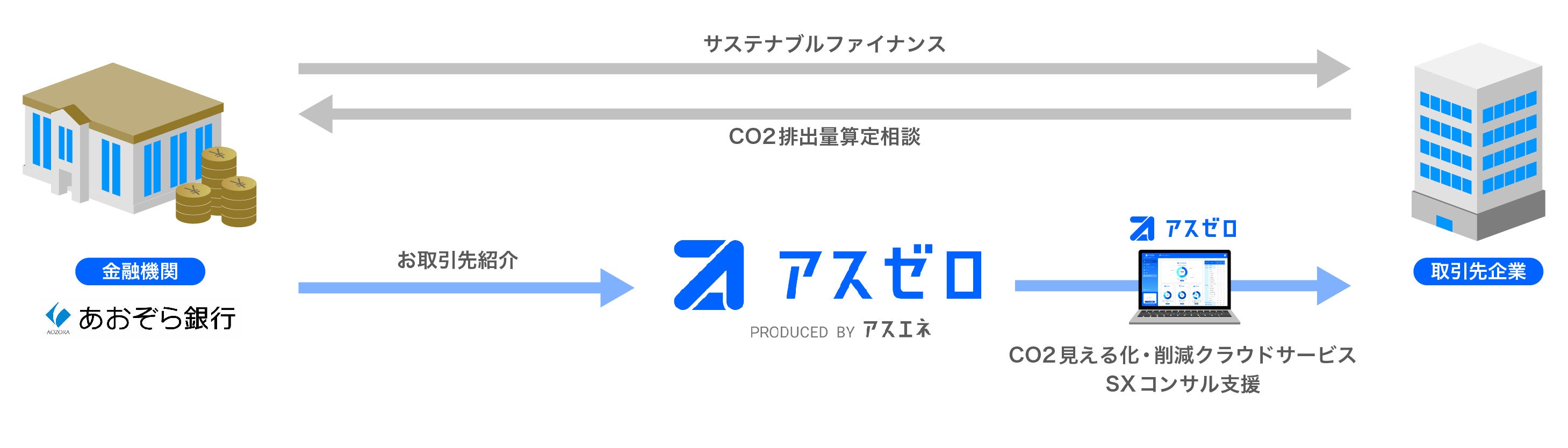 CO2排出量見える化・削減クラウドサービス「アスゼロ」を提供するアスエネ株式会社(本社:東京都港区、代表取締役CEO:西和田 浩平、以下「当社」)は、株式会社あおぞら銀行(本社:東京都千代田区、代表取締役社長兼最高経営責任者(CEO):谷川 啓、以下「あおぞら銀行」)と顧客紹介に係る契約(以下「本契約」)を締結しました。アスゼロの脱炭素ワンストップソリューションを通じて、企業の脱炭素経営を支援します。