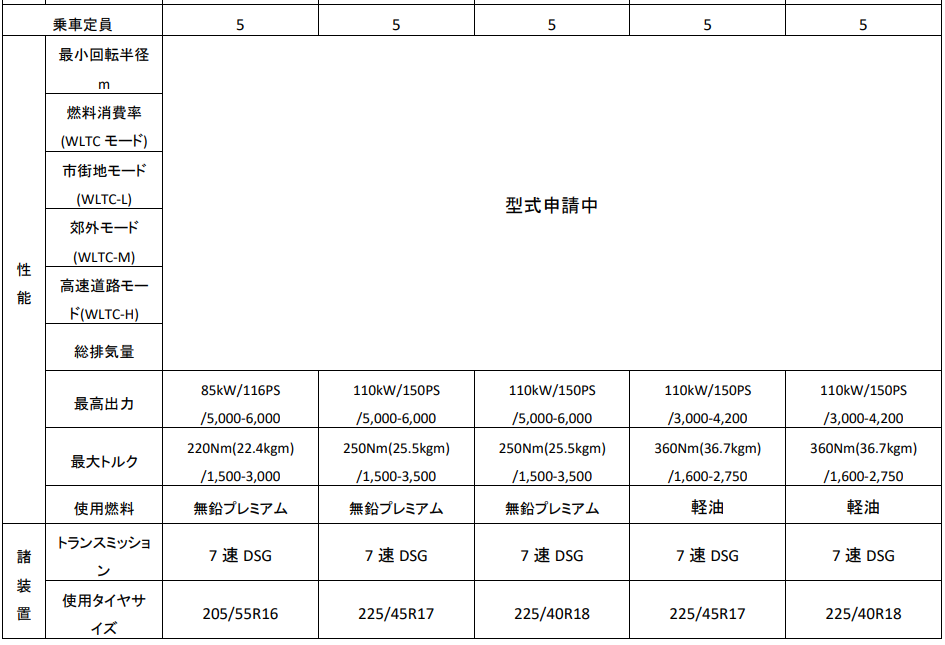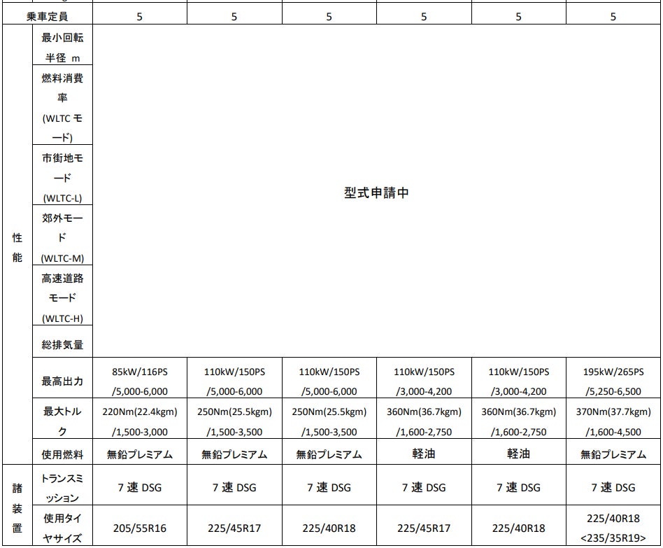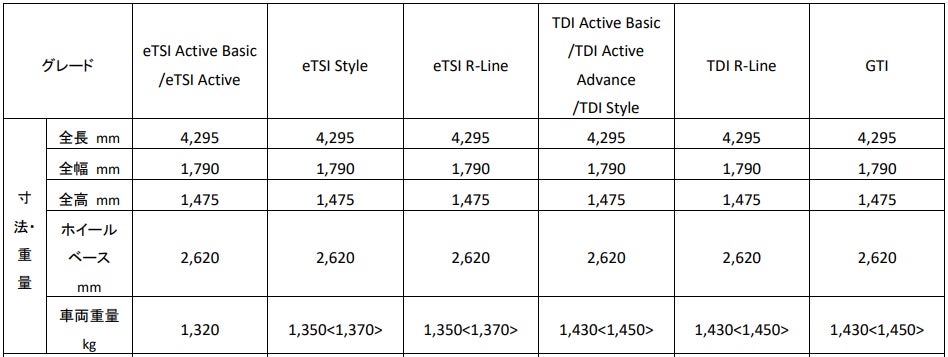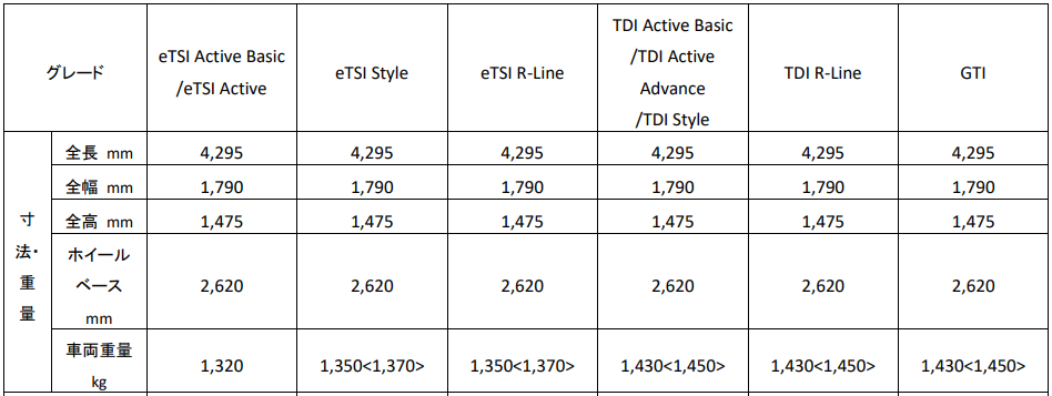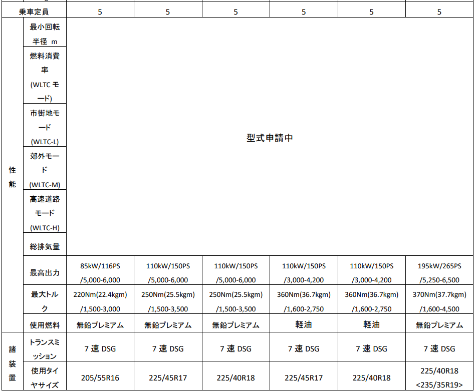新型「Golf」 諸元表