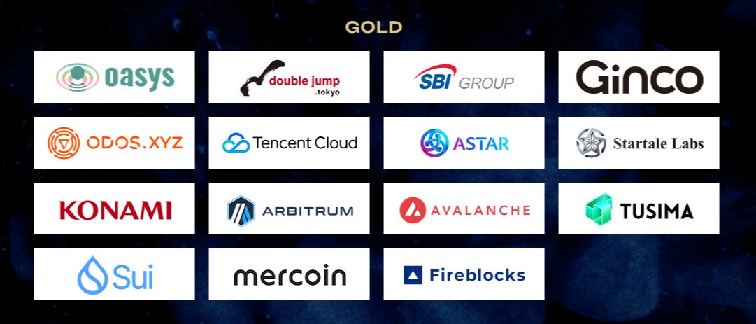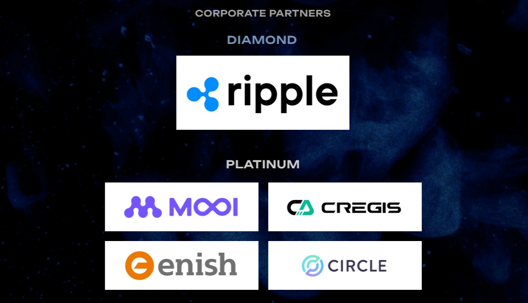 エンタープライズ・ブロックチェーンおよび暗号資産ソリューションのリーディング・プロバイダーであるリップル社が、ダイヤモンドコーポレートパートナーとして協賛いただくほか、MOOI、CREGIS、enish、Circle、Oasys、double jump.tokyo、SBIホールディングス、Ginco、ODOS.XYZ、Tencent Cloud、Astar Network、Startale Labs、コナミデジタルエンタテインメント、Arbitrum、Avalanche、Tusima、Sui、mercoin、Fireblocks 等60社以上の企業パートナーとともに、Web3の普及を促進します。