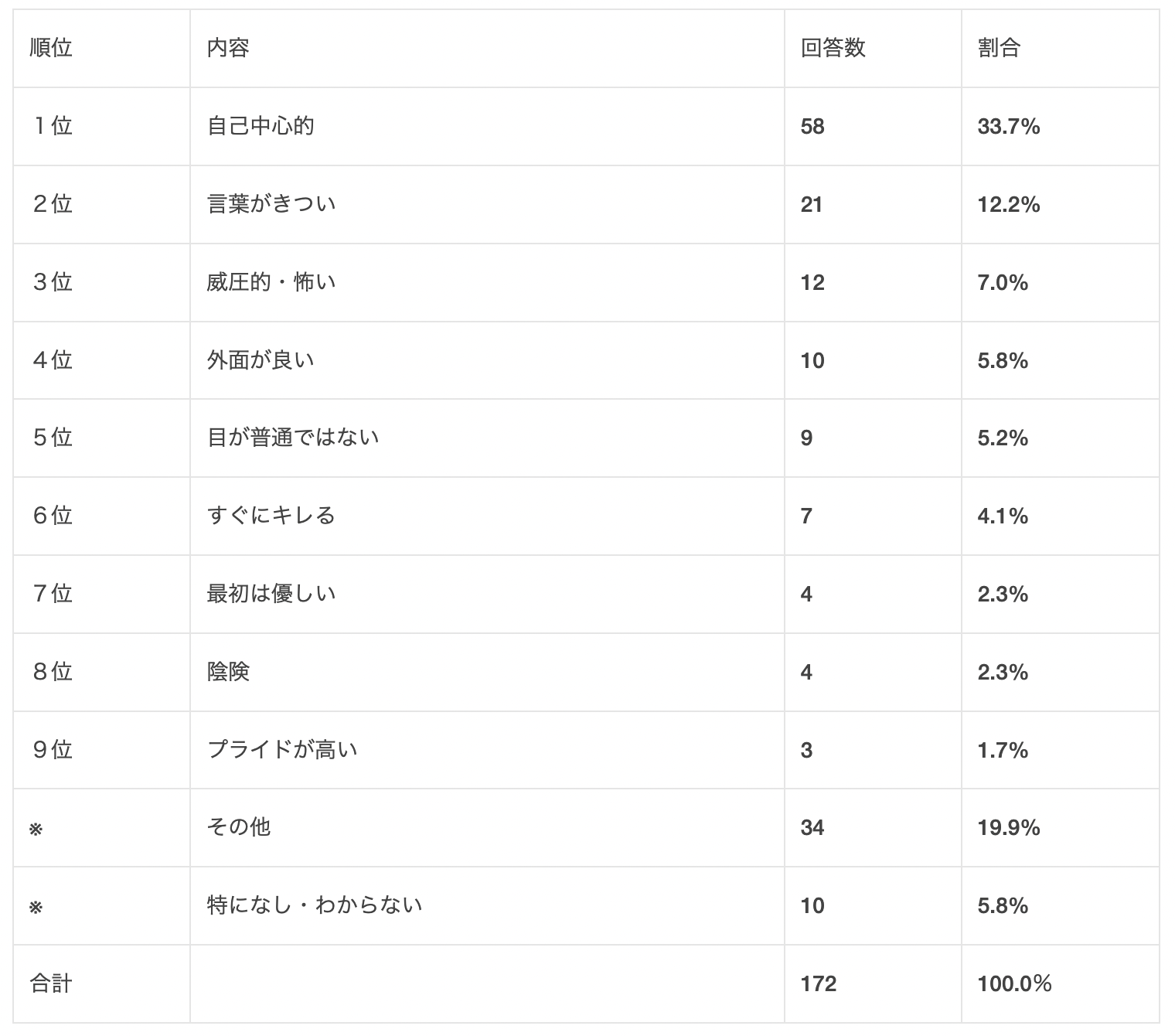 以下「外面が良い」「目が普通ではない」「すぐにキレる」などとなっています。