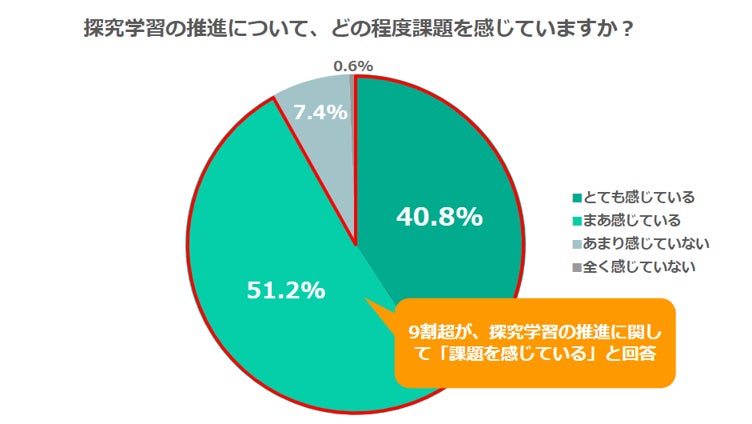 一方で依然9割超が「課題を感じている」結果に。特に「授業案やカリキュラムの設計」「調べ学習で終わってしまう」などが課題