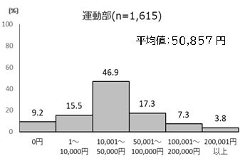 ・運動部は10,001~50,000円が46.9%と最も多く、スポーツクラブは支出額の分布にばらつきがあり、50,001円以上の高額負担が多い