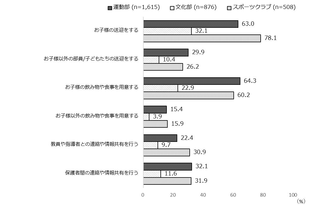子どもが加入する部活動やクラブ、教室における保護者の関与についてたずねた(図表1)。いずれの活動においても「お子様の送迎をする」(運動部63.0%、文化部32.1%、スポーツクラブ78.1%、以下同)が、最も高い。続いて「お子様の飲み物や食事を用意する」(64.3%、22.9%、60.2%)、「保護者間の連絡や情報共有を行う」(32.1%、11.6%、31.9%)という結果であった。特に、スポーツクラブでは送迎や指導者との連絡が多いことがわかる。