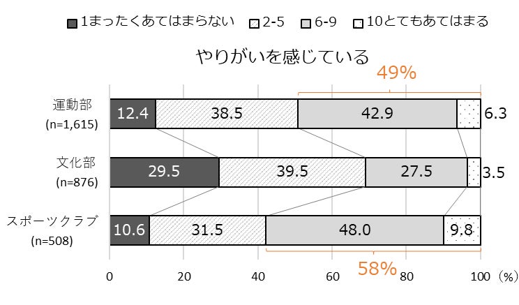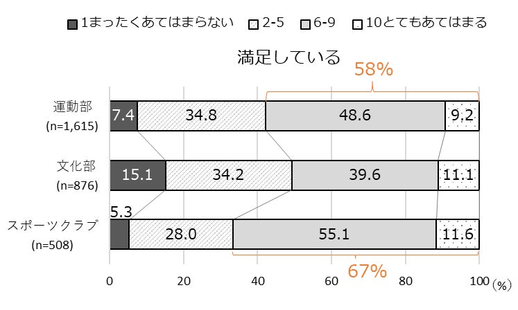 子どもが加入する活動(運動部・文化部・スポーツクラブ)ごとに、保護者が自身の関わり方をどのように感じているかを、1=まったくあてはまらない、10=とてもあてはまるまでの10段階でたずねた(図表2)。6点以上と回答した割合をみると、「やりがいを感じている」は、スポーツクラブ57.8%>運動部49.2%>文化部31.0%であった。同様に、「満足している」はスポーツクラブ66.7%>運動部57.8%>文化部50.7%と、スポーツクラブに子どもを通わせている保護者のやりがいや満足度が総じて高い結果となった。