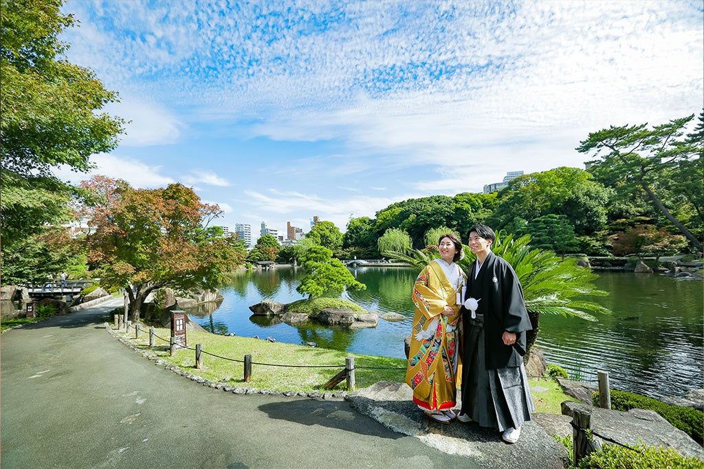 徳川家と縁深い歴史ある日本庭園。池にかかる橋や日本家屋、四季折々の自然が伝統的な婚礼衣装によく合います。