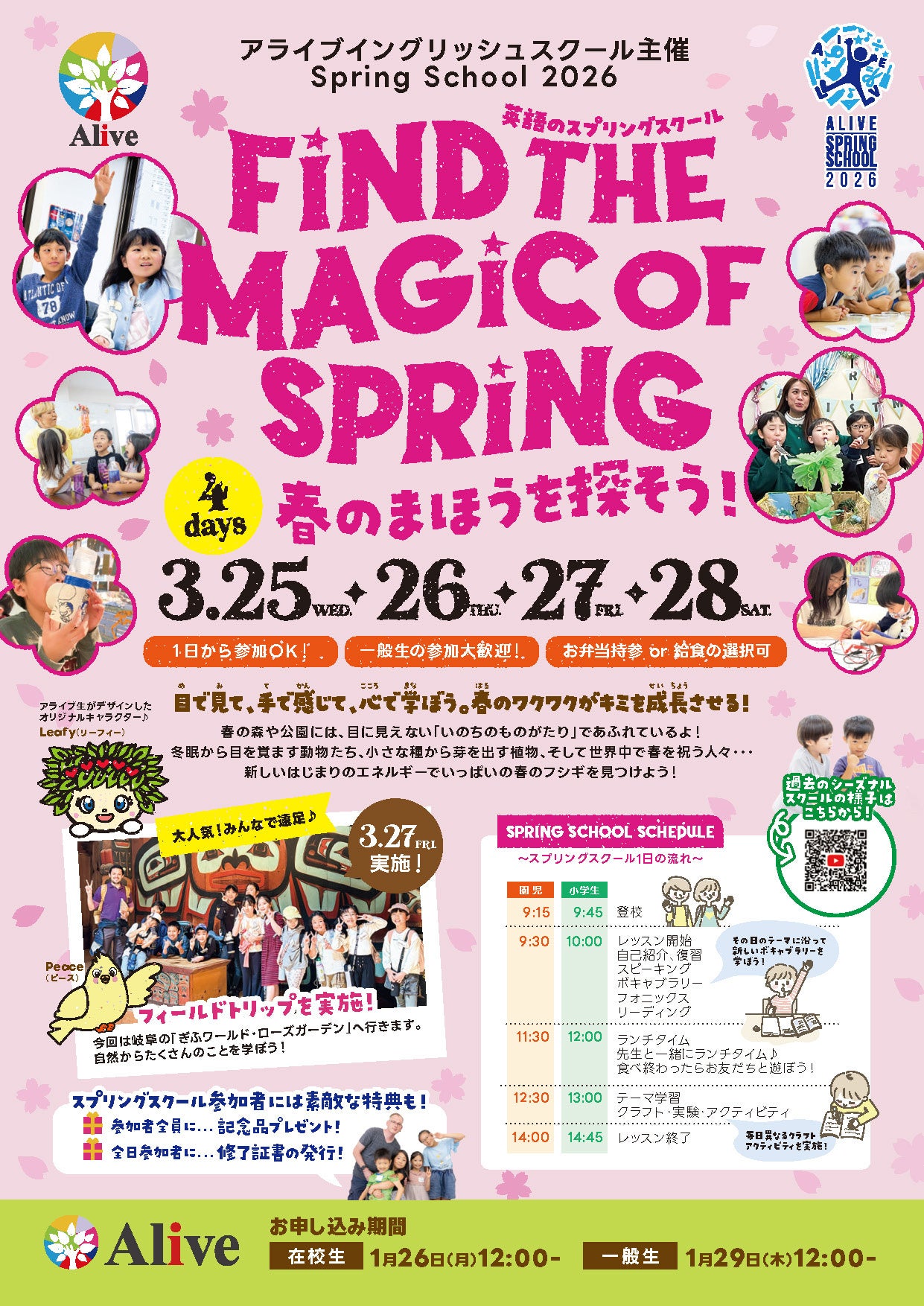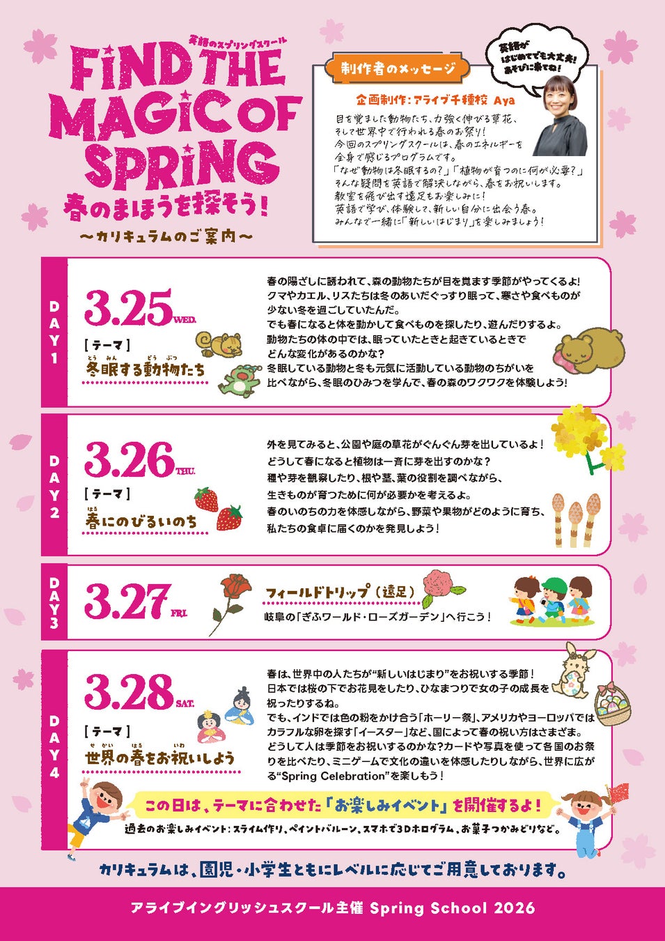 英語の保育園・英会話教室・英語学童を運営する株式会社アライブ(本社:愛知県名古屋市、代表取締役:三井博美)は、2026年3月25日(水)〜28日(土)の4日間、未就園児・園児・小学生を対象とした春休み特別イベント『アライブ スプリングスクール2026』を開催いたします。本イベントのテーマは「FIND THE MAGIC OF SPRING 〜春のまほうを探そう!〜」です。