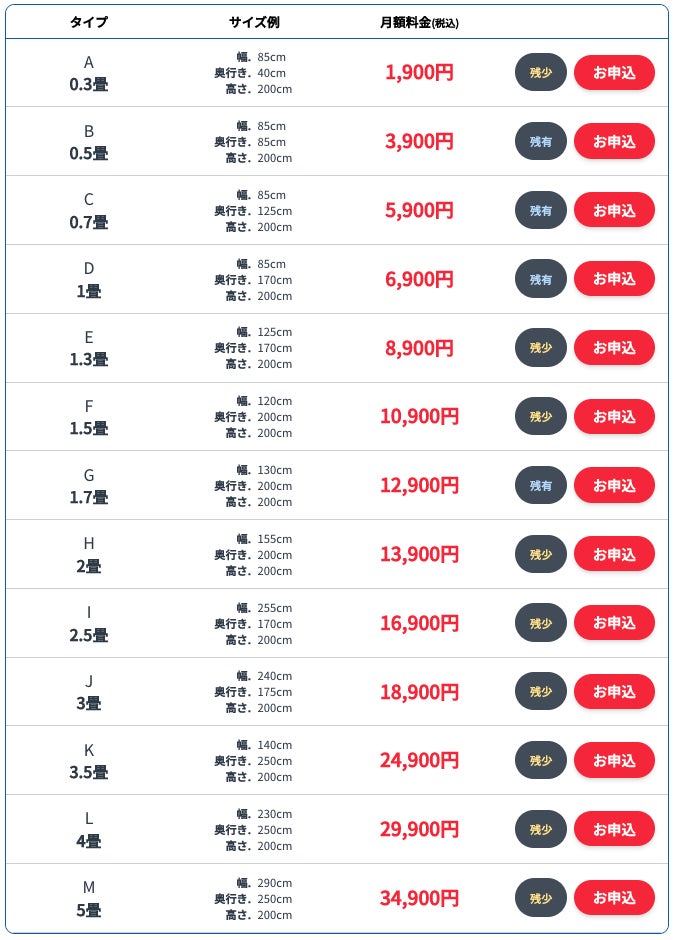 - 部屋タイプとサイズ、月額料金はこちら