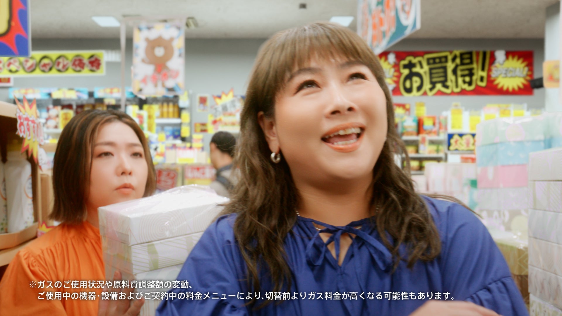「安さ」が売りの量販店でお買い物を楽しむお二人。お買い得商品を次々と手に取り、買い物かごに入れていきます。そんななか「でも…」とともこさん。お店のお買い得商品に負けないくらい、関電ガスもおトク※であることを、やすよさん、そしてお買い物中の他のお客さんにまで力いっぱいアピールします。お二人のお茶目で可愛らしい仕草ややり取りも見どころです。