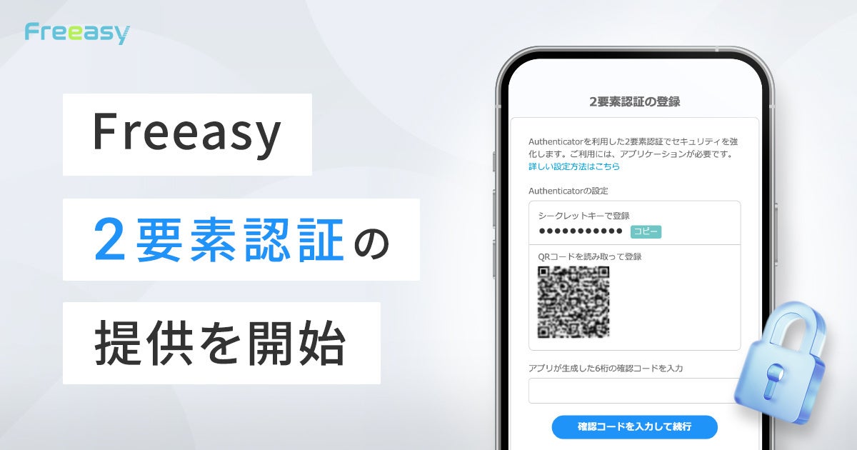 従来のID・パスワードに加え、一定時間経過で変化するワンタイムパスワードを用いたログイン方式となります。本機能はFreeasyをご利用中のすべてのアカウントで利用可能で、追加費用は発生しません。