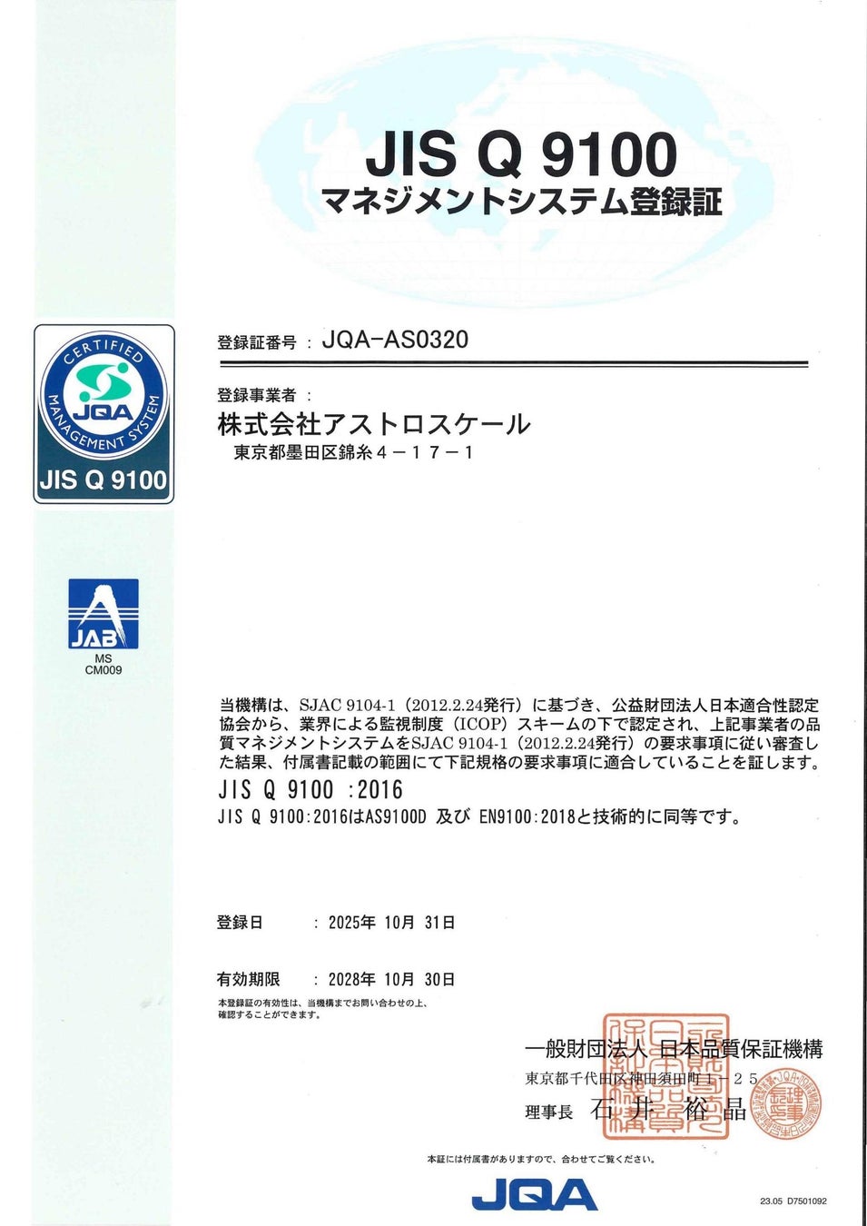 持続可能な宇宙環境を目指し、軌道上サービスに取り組む株式会社アストロスケールホールディングス(本社:東京都墨田区、創業者兼 CEO 岡田光信)の日本子会社である株式会社アストロスケール(本社:東京都墨田区、代表取締役社長 加藤英毅、以下「アストロスケール」)はこの度、航空宇宙・防衛産業に特化した品質マネジメントシステムの国際規格であるJIS Q 9100の認証を取得したことをお知らせいたします。