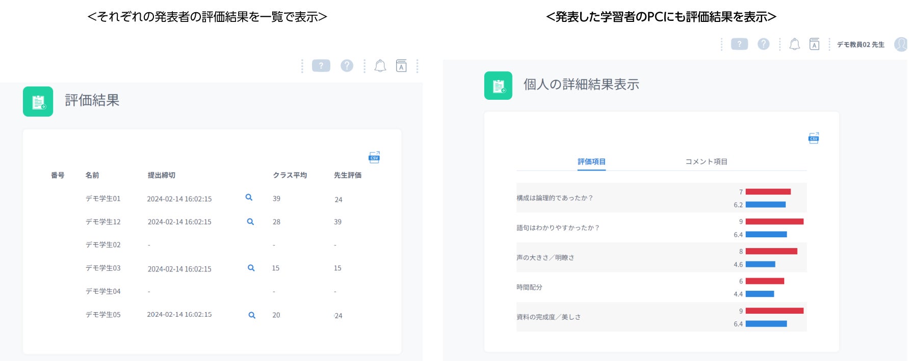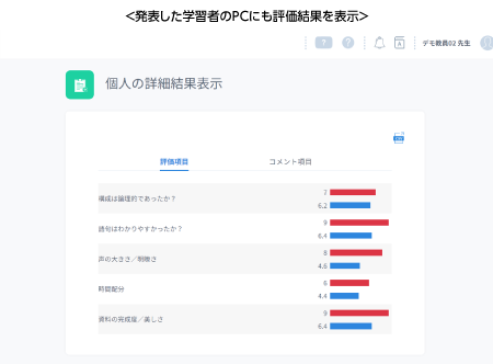 『CaLabo® MX』の評価シートは発表した学習者にもメリットがあります。クラス全員の評価が終了した時点で、学習者本人も即座に結果を確認できます。自分の英語プレゼンテーションは他の人にどう見えたのかがすぐに分かりますので、苦手分野の克服など次の学習目標が立てやすくなります。